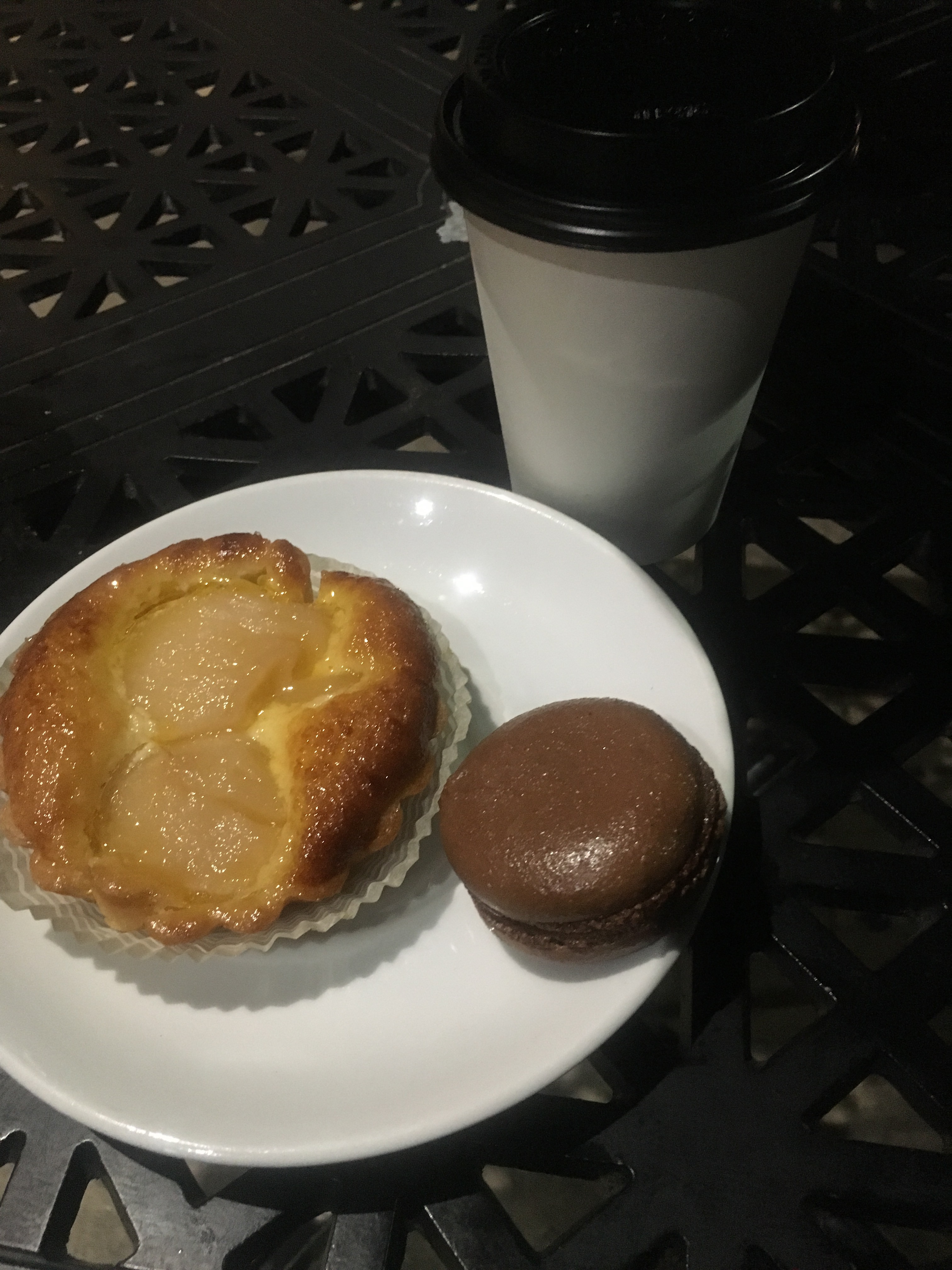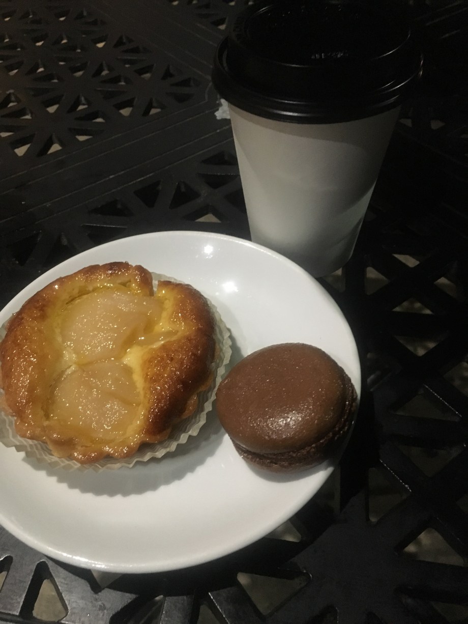 at Amelie’s French Bakery. I’ve actually never been here and I’ve been meaning to check it out. I ordered a pear tart and when the server learned it was my first visit, she recommended the macaroon. I decided on the salted caramel brownie macaroon and added coffee.